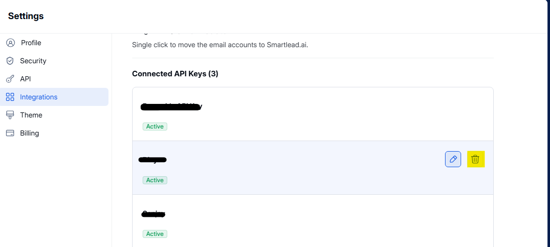 Step 6: Delete an API KeyTo remove an integration, click on the trash icon (