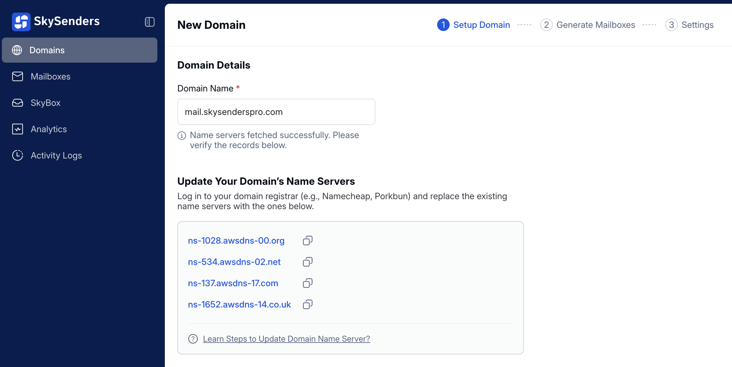 SkySenders will generate Nameserver (NS) records specifically for the subdomain.